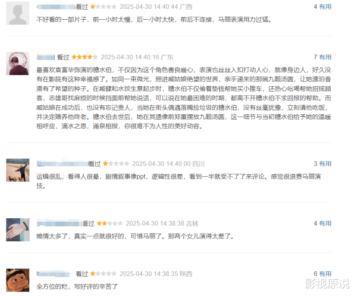 还有不少观众表示,《水饺皇后》中马丽的演技确实不错,但影片的剧情逻辑性很差,煽情的画面太多影响观感,另外该片的整体节奏也让人感觉不舒服。